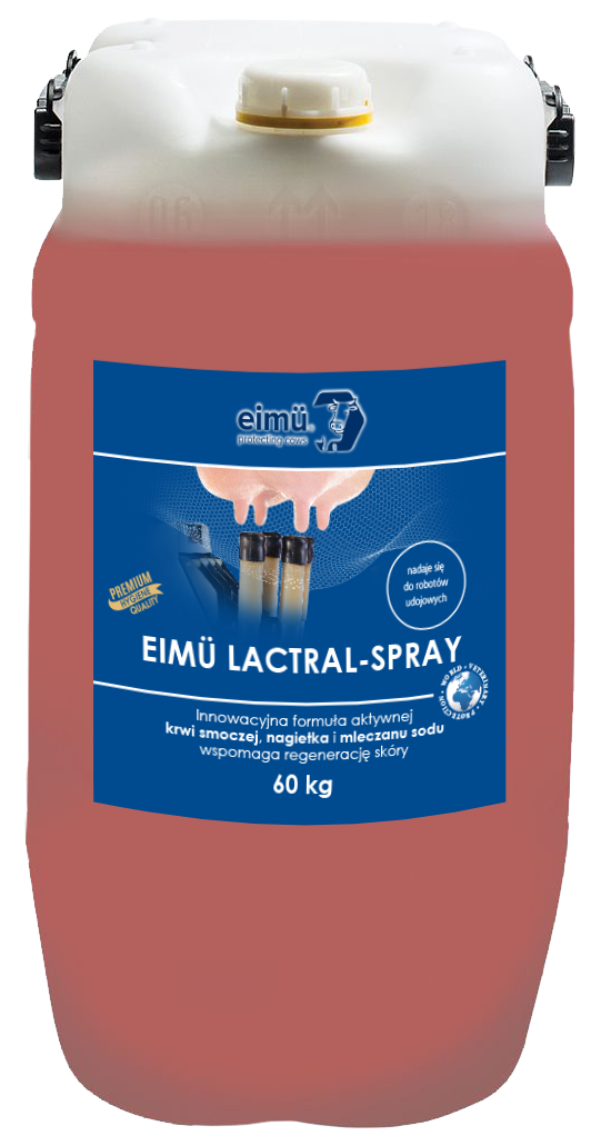 Eimü Lactral-Spray zawiera innowacyjny kompleks substancji czynnych: krew smoka, nagietek i mleczan sodu. Preparat zawiera wysokiej jakości składniki pielęgnacyjne, które zapewniają intensywną pielęgnację strzyków. Eimü Lactral-Spray to naturalna ochrona strzyków – wzmocnienie mikrobiomu skóry. Eimü Lactral-Spray nadaje się do wszystkich systemów natryskowych i robotów udojowych. Eimü Lactral-Spray nadaje się do stosowania w rolnictwie ekologicznym, posiada certyfikat FiBL.